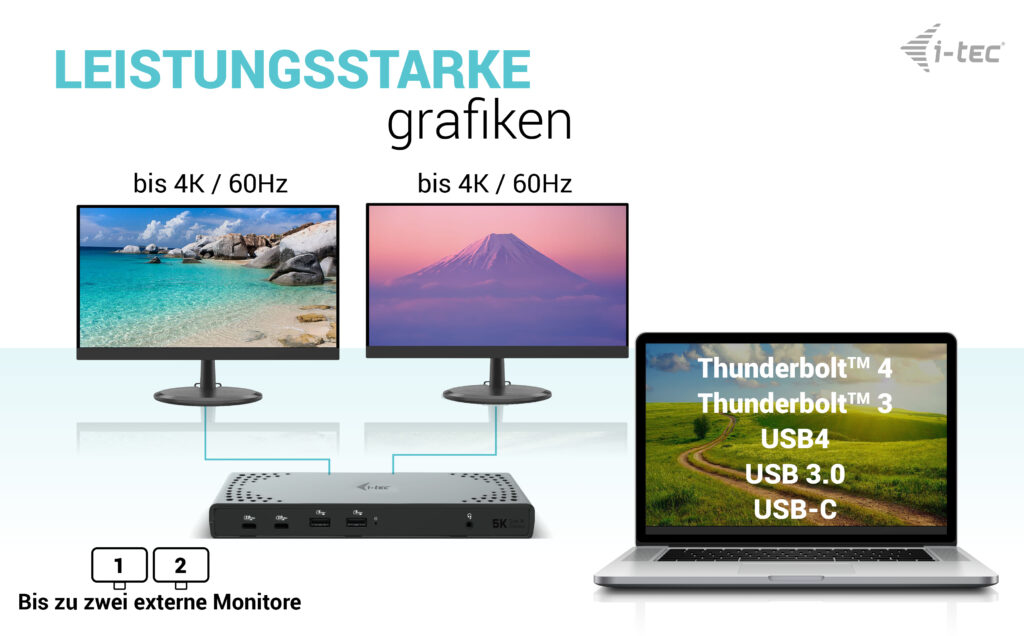 • Verbindung: 1x RJ-45, 2x USB-C 3.1 (Buchse), 4x USB-A 3.0 (Buchse), 2x HDMI 2.0 (Buchse), 2x DisplayPort (Buchse), 1x Klinke (Buchse)