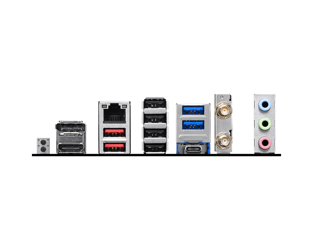 • Anschlüsse extern: 1x DisplayPort 1.4 (iGPU), 1x HDMI 2.1 (iGPU), 1x USB-C 3.1 (10Gb/​s), 2x USB-A 3.1 (10Gb/​s), 2x USB-A 3.0 (5Gb/​s), 4x USB-A 2.0 (480Mb/​s), 3x 3.5mm Klinke (Realtek ALC897), 1x RJ-45 (5GBase-T, Realtek RTL8126VB), 2x Antennenanschluss RP-SMA