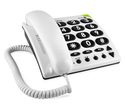 Schnurgebundenes Telefon mit großen Tasten inkl. Direktwahl- und Kurzwahlfunktion, HAC (Hörgerätekompatibilität) und optischer Anrufsignalisierung für eingehende Anrufe.